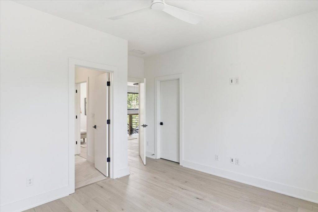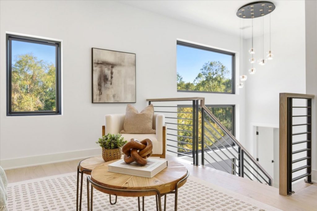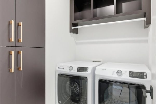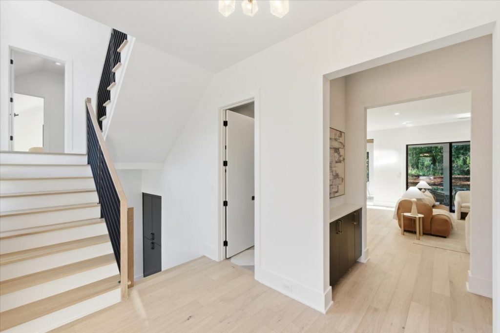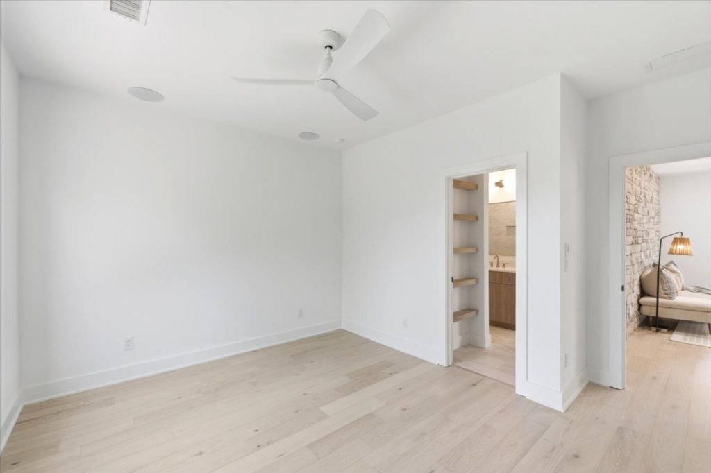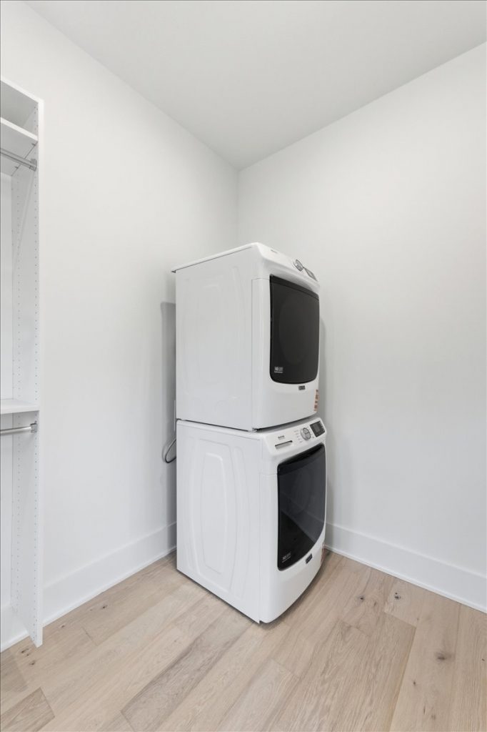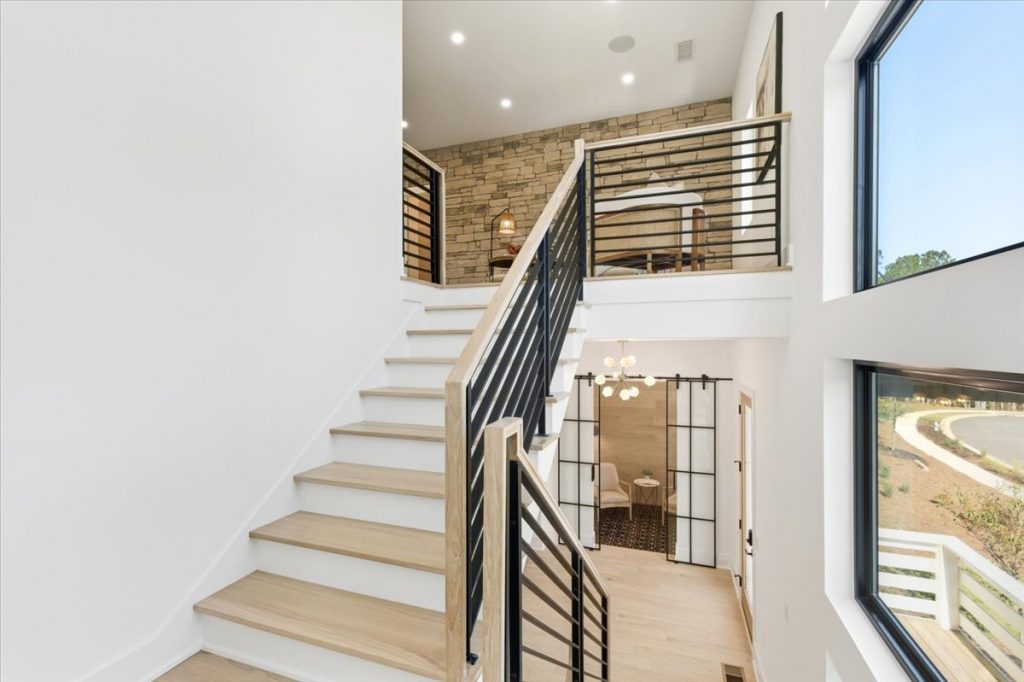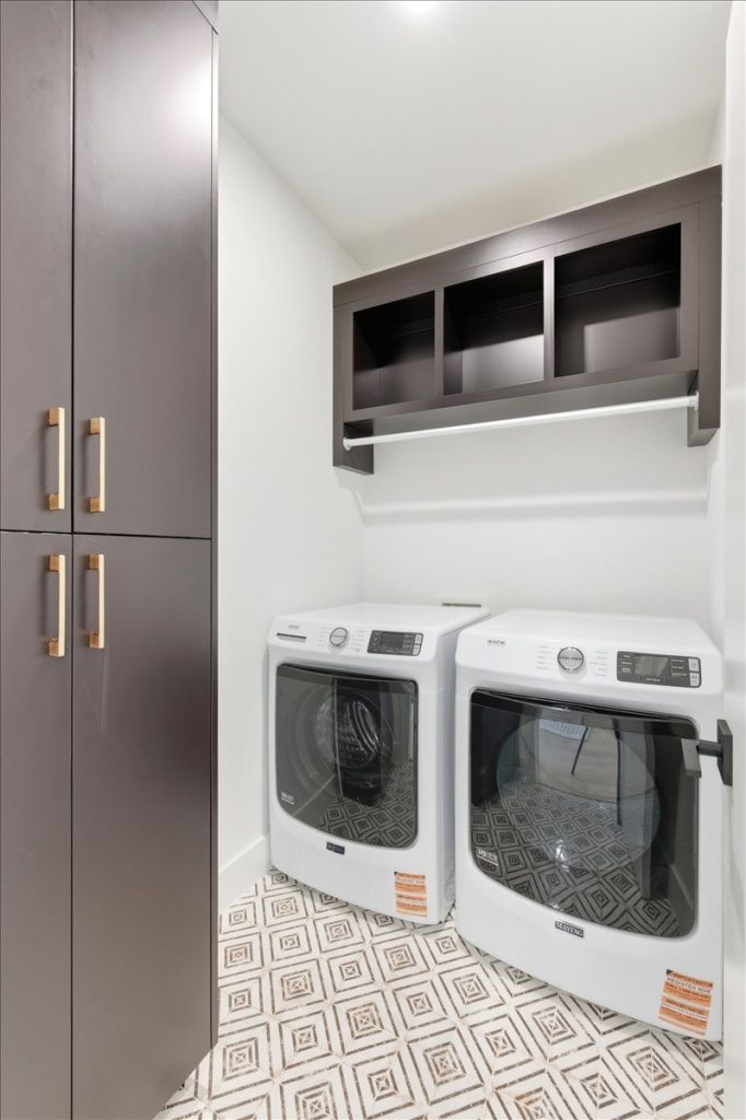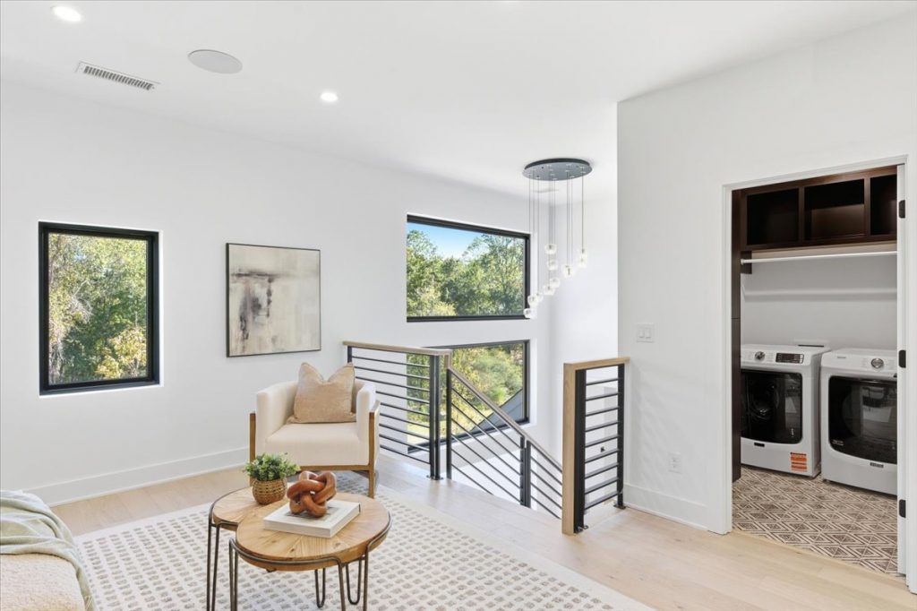 Upstairs, a spacious loft features a stone accent wall and an upper-level laundry room with designer cabinetry and tile. Two additional secondary bedrooms each have private en suites.