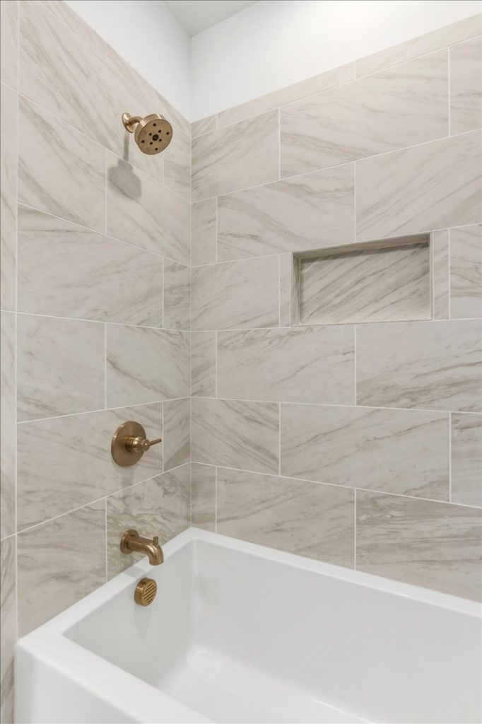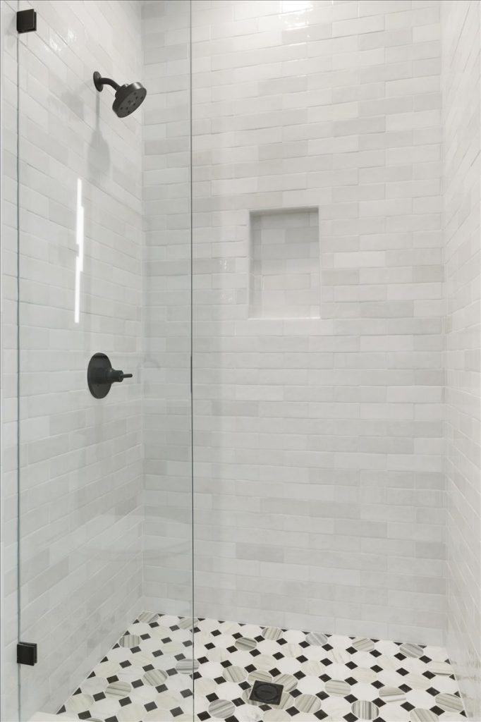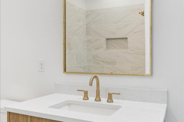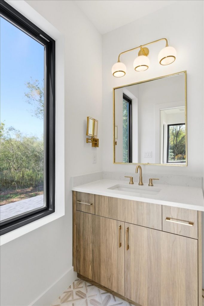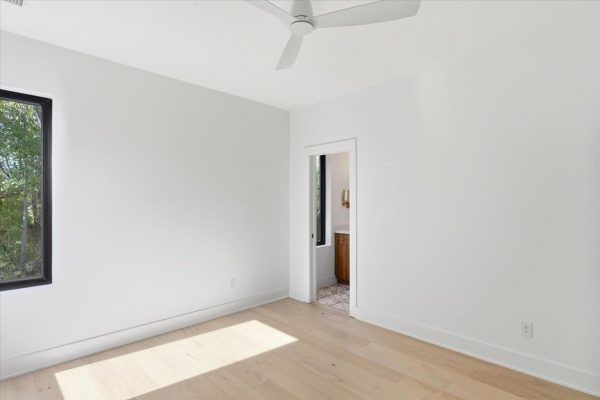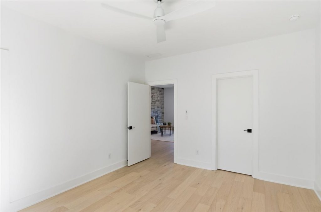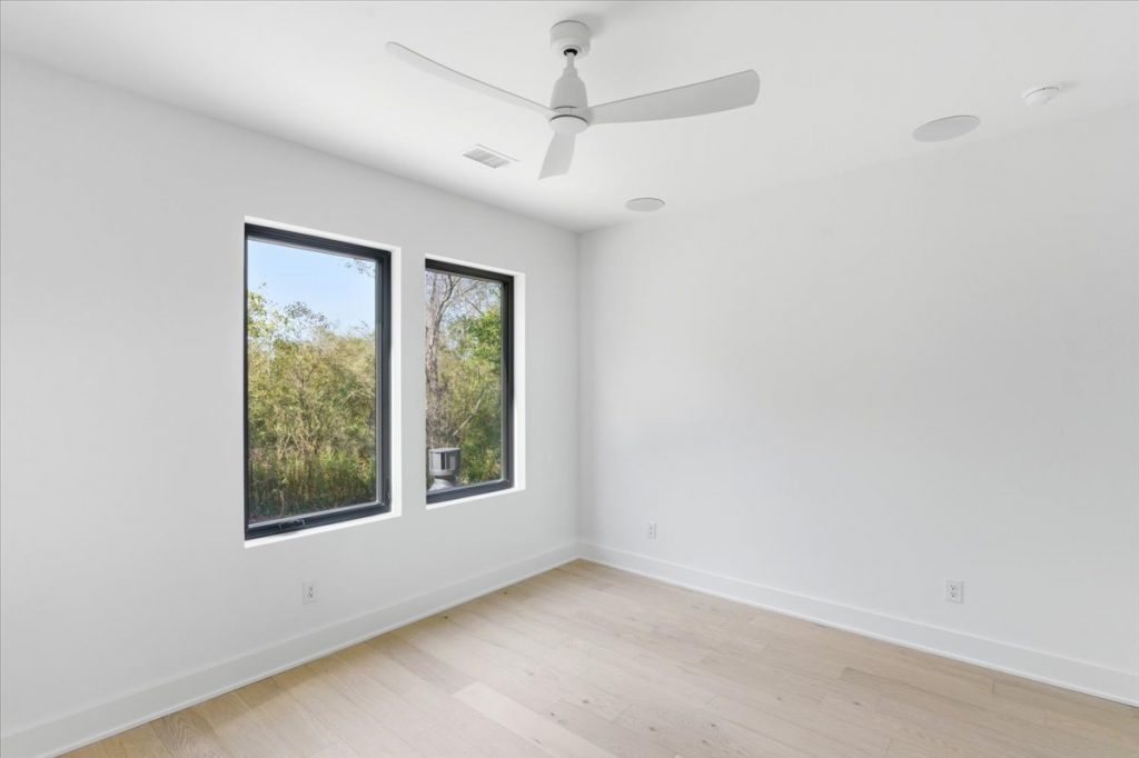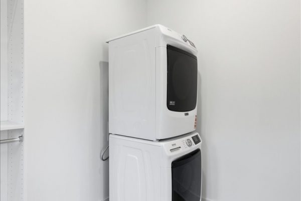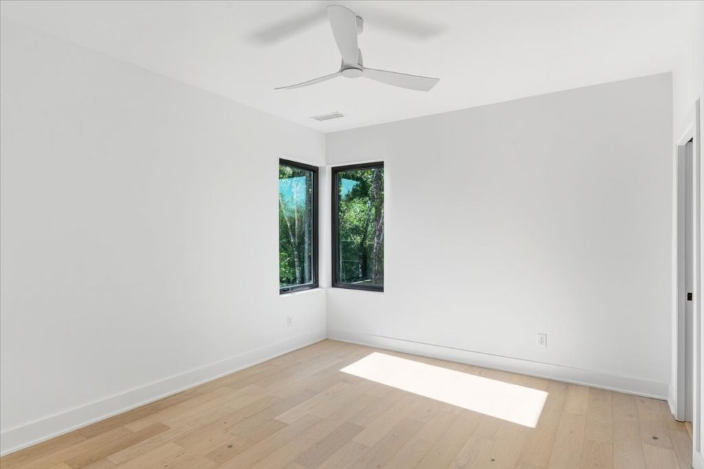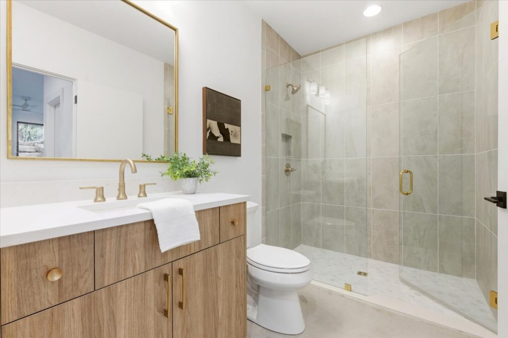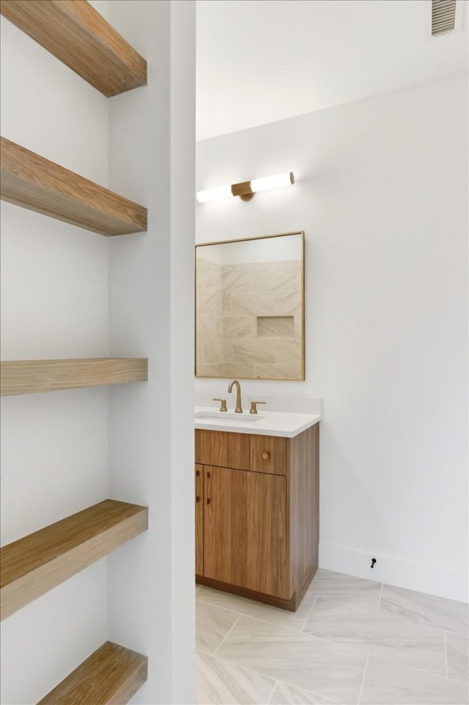 Upstairs, a spacious loft features a stone accent wall and an upper-level laundry room with designer cabinetry and tile. Two additional secondary bedrooms each have private en suites.
