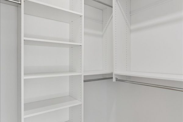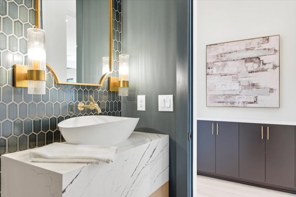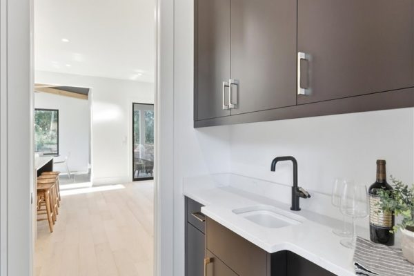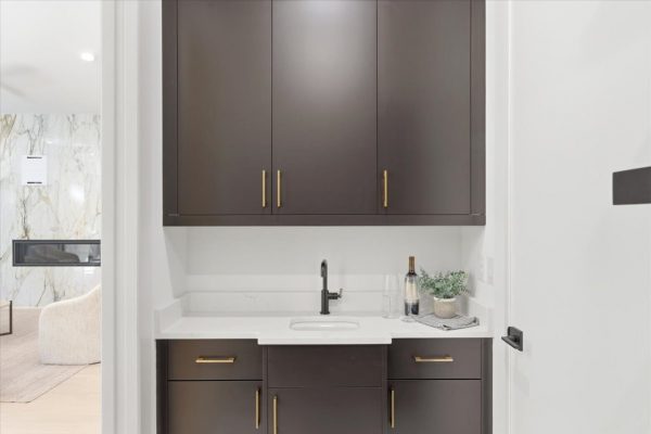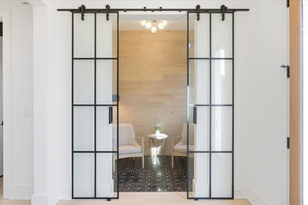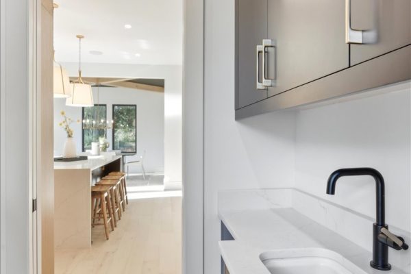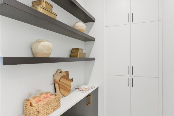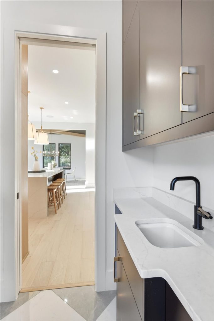 An elegant office or sitting room off the foyer showcases glass-framed metal doors, designer lighting, and stylish tile. The scullery is equipped with custom shelving and quartz countertops for added functionality and beauty.