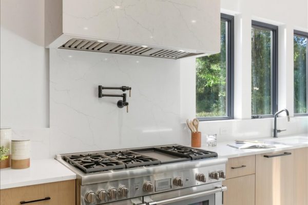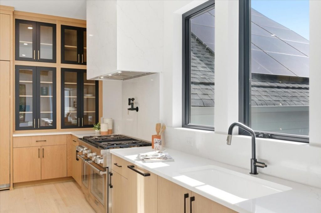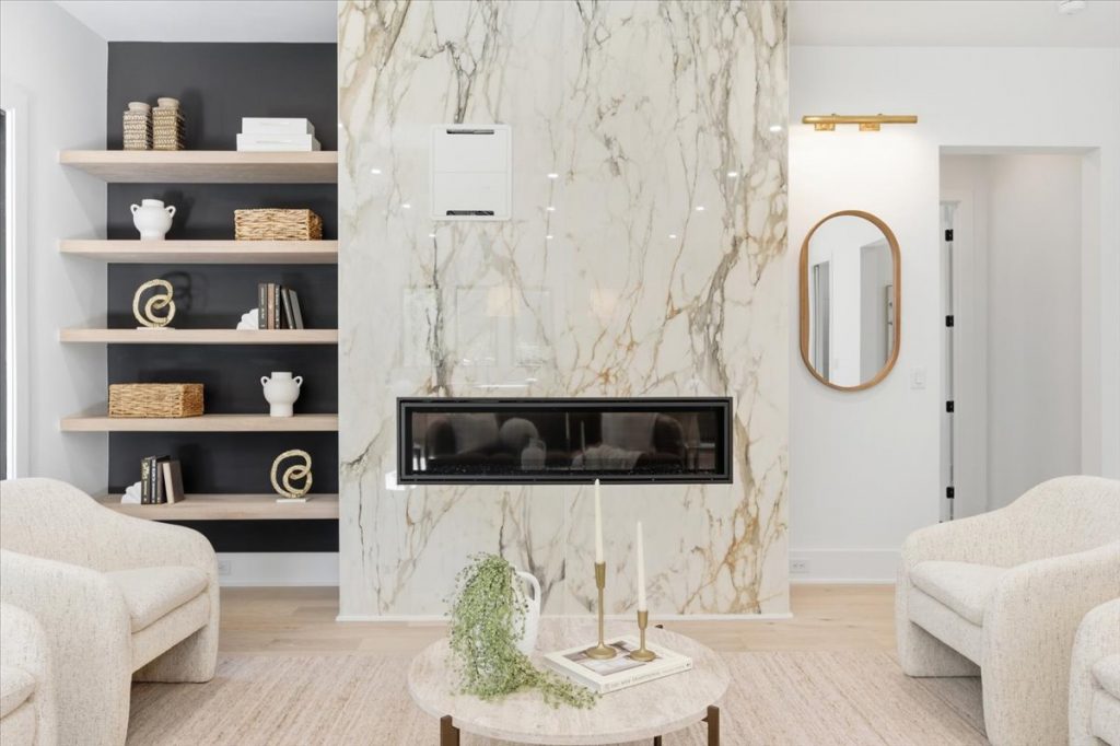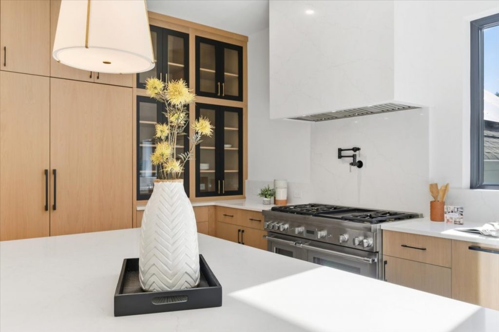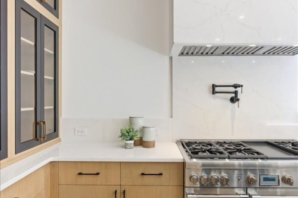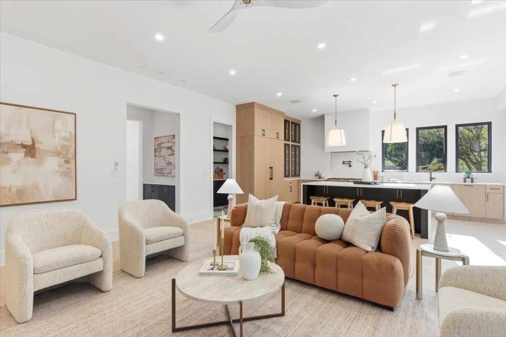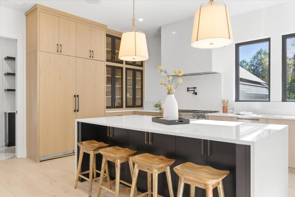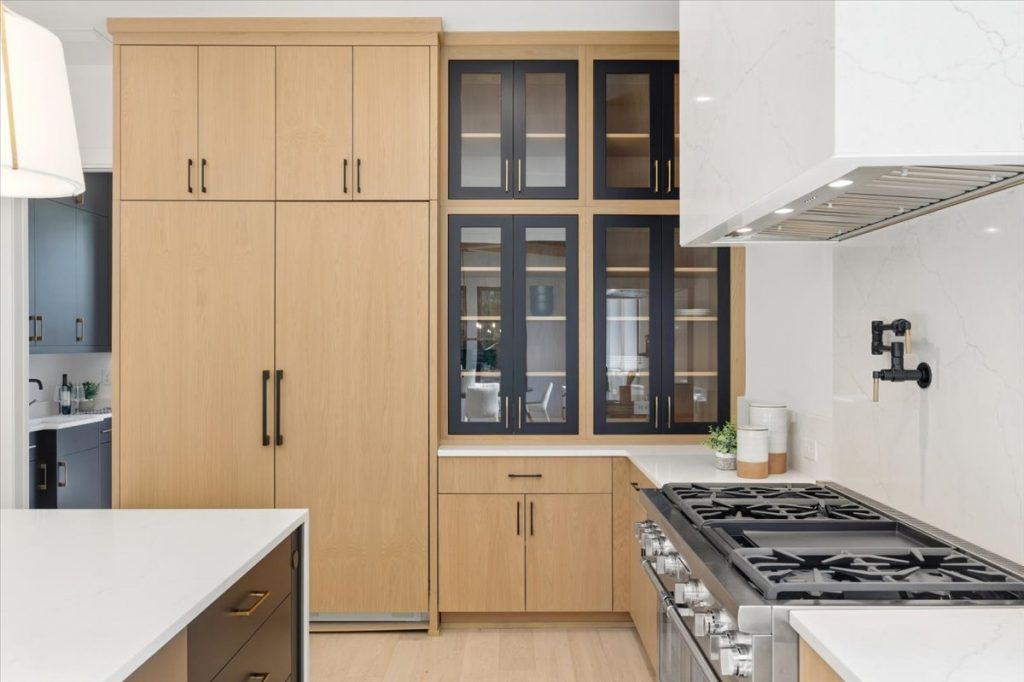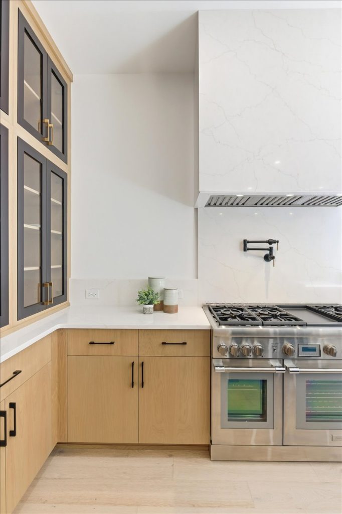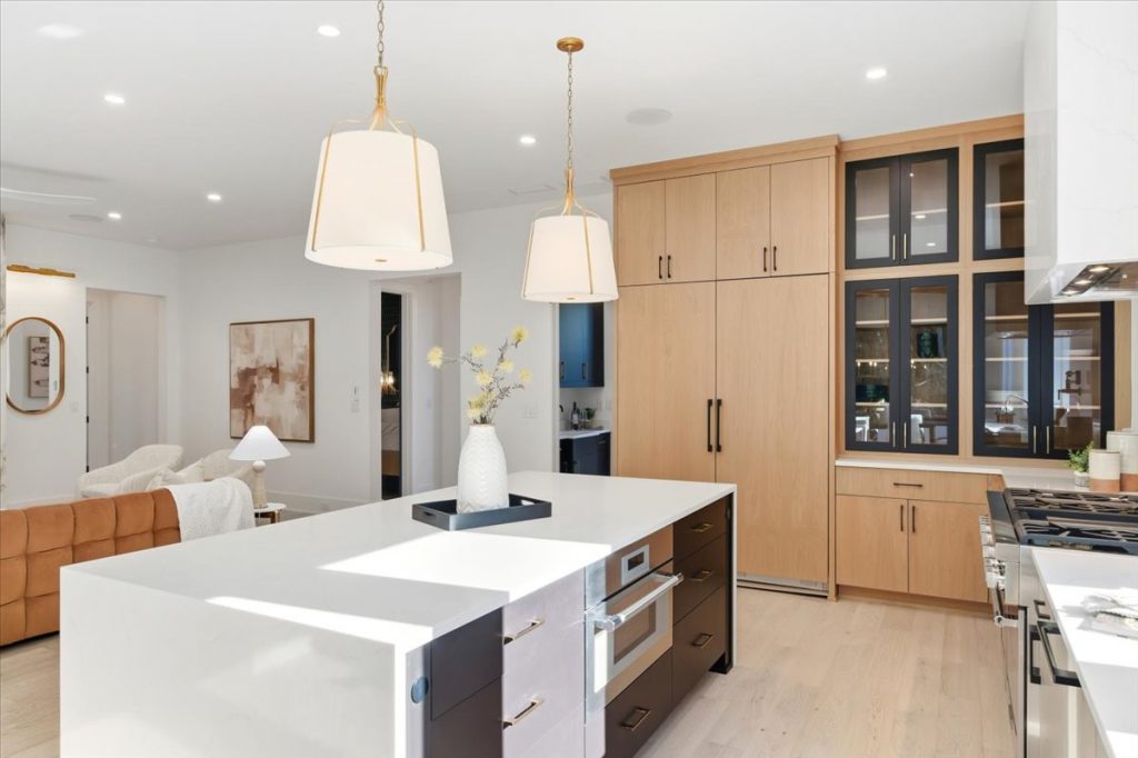 Inside, the gourmet kitchen is a true showstopper. It features Sub-Zero 30” refrigerator and freezer towers, a 48” Thermador Pro Range with dual ovens, and a microwave drawer. The quartz waterfall island is complemented by a matching quartz backsplash and chimney hood, creating a seamless and timeless design. Metal and glass cabinet doors near the Sub-Zero add a refined touch, ideal for displaying glassware or dinnerware.