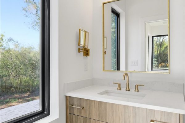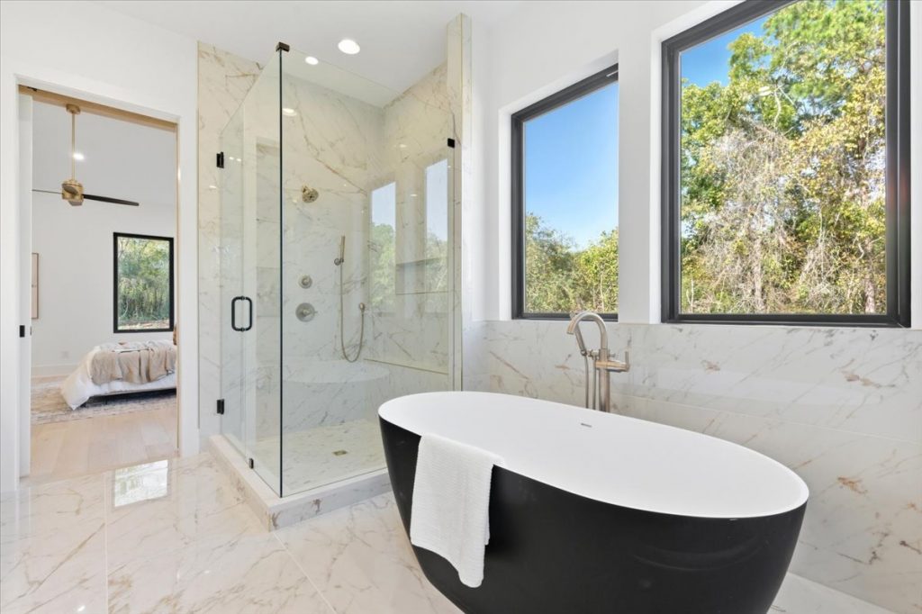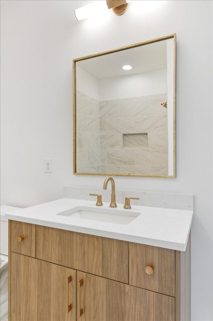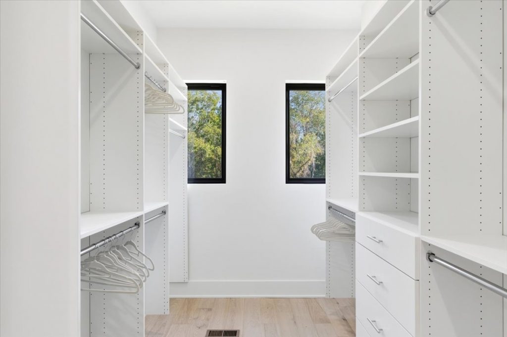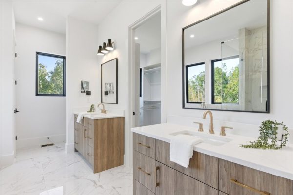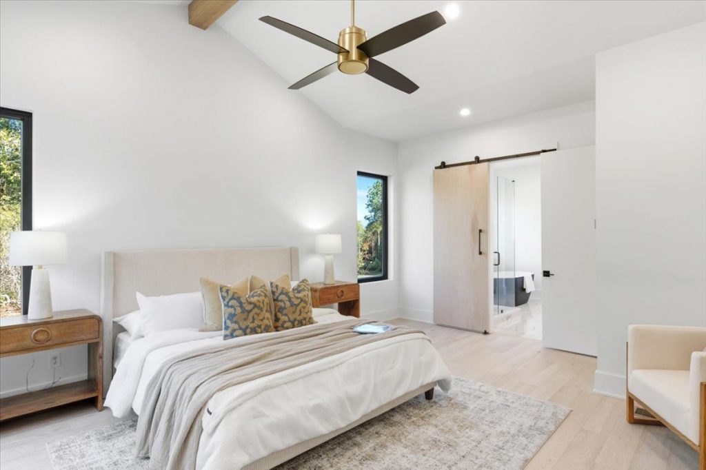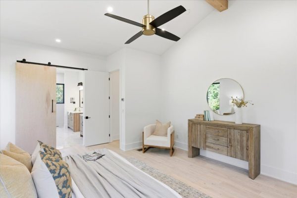 The open-concept floor plan includes hardwood flooring throughout both the main and upper levels. The vaulted primary suite on the main level features a center beam, a luxurious bathroom with oversized slab tiles, gold-accented fixtures, makeup mirrors, and a custom walk-in closet with built-in shelving.