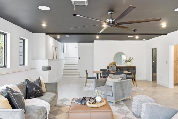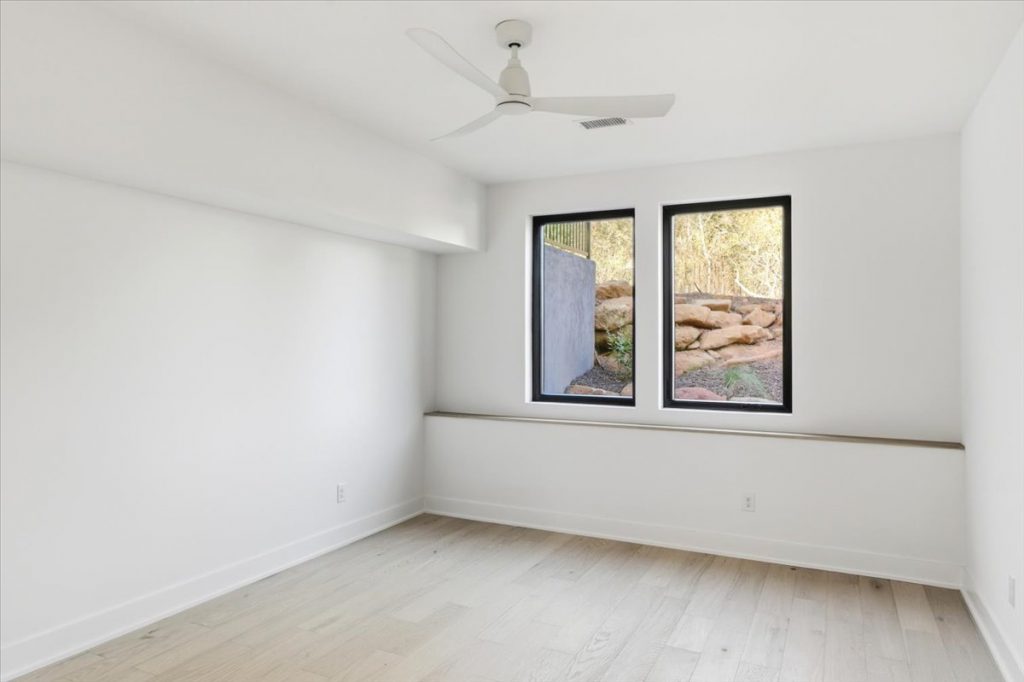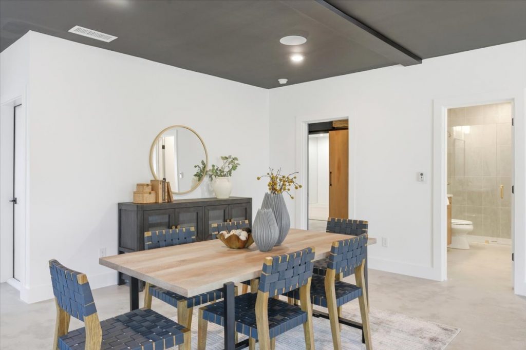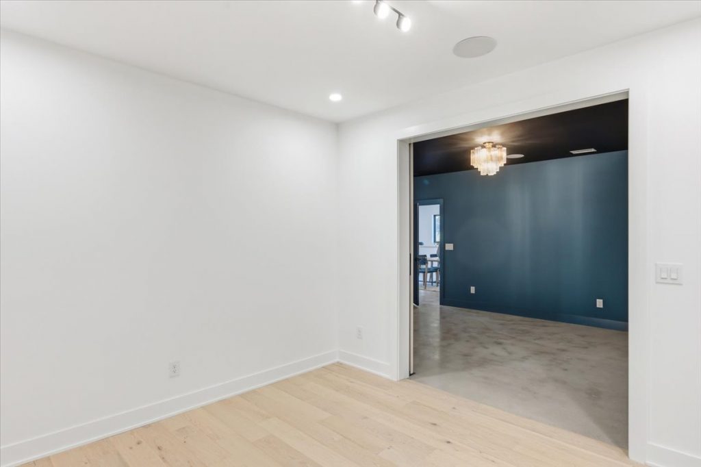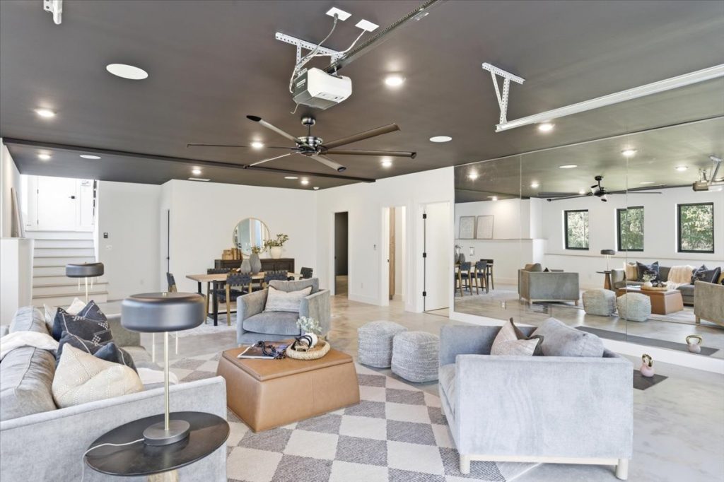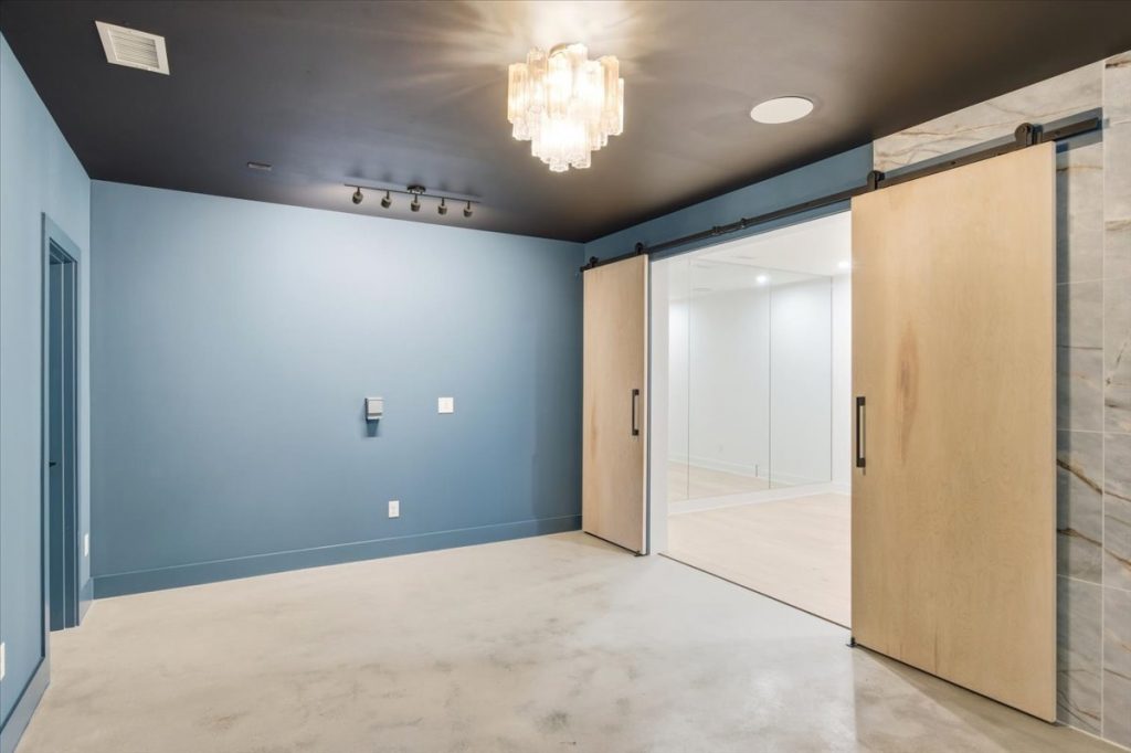 The terrace level also includes a versatile mirrored room—ideal for a home gym, recreation space, or craft room. There’s a fully outfitted wellness center/gym, pre-wired and plumbed for a cold plunge and sauna, complete with mood lighting, barn doors, and mirrored walls. Additionally, there’s a terrace-level bedroom with a full bathroom and closet.