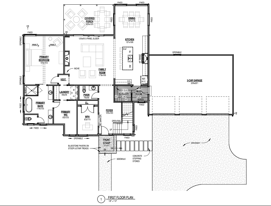 Inside, the primary suite on the main level provides comfort and privacy with a vaulted ceiling, a generous walk-in closet connected to the laundry, and a well-appointed bath featuring dual vanities, a soaking tub, and a separate shower. The open main living area seamlessly connects the kitchen, dining, and family room, filled with natural light and enhanced by large picture windows and expansive three-panel sliding glass doors that create a strong indoor–outdoor connection.