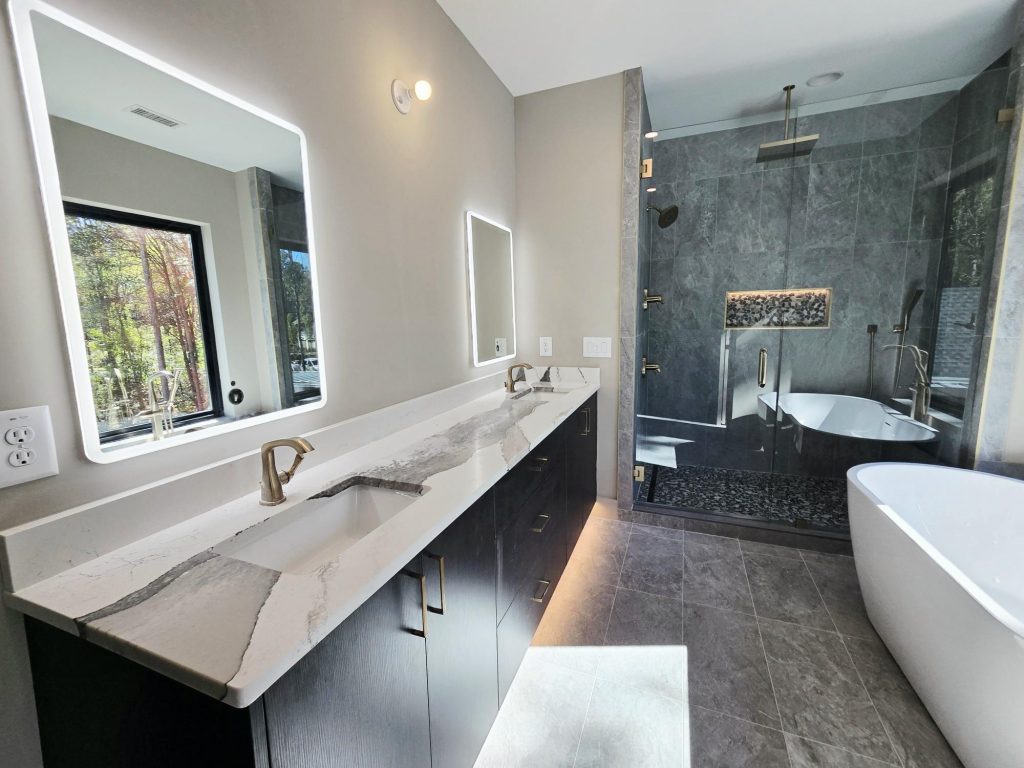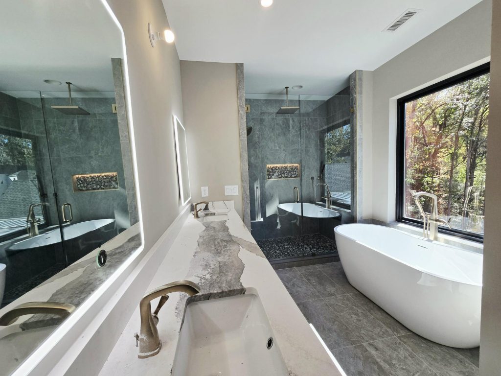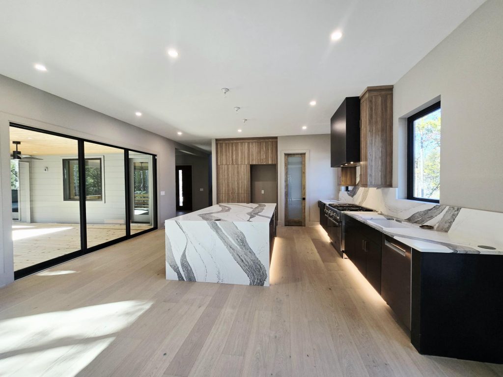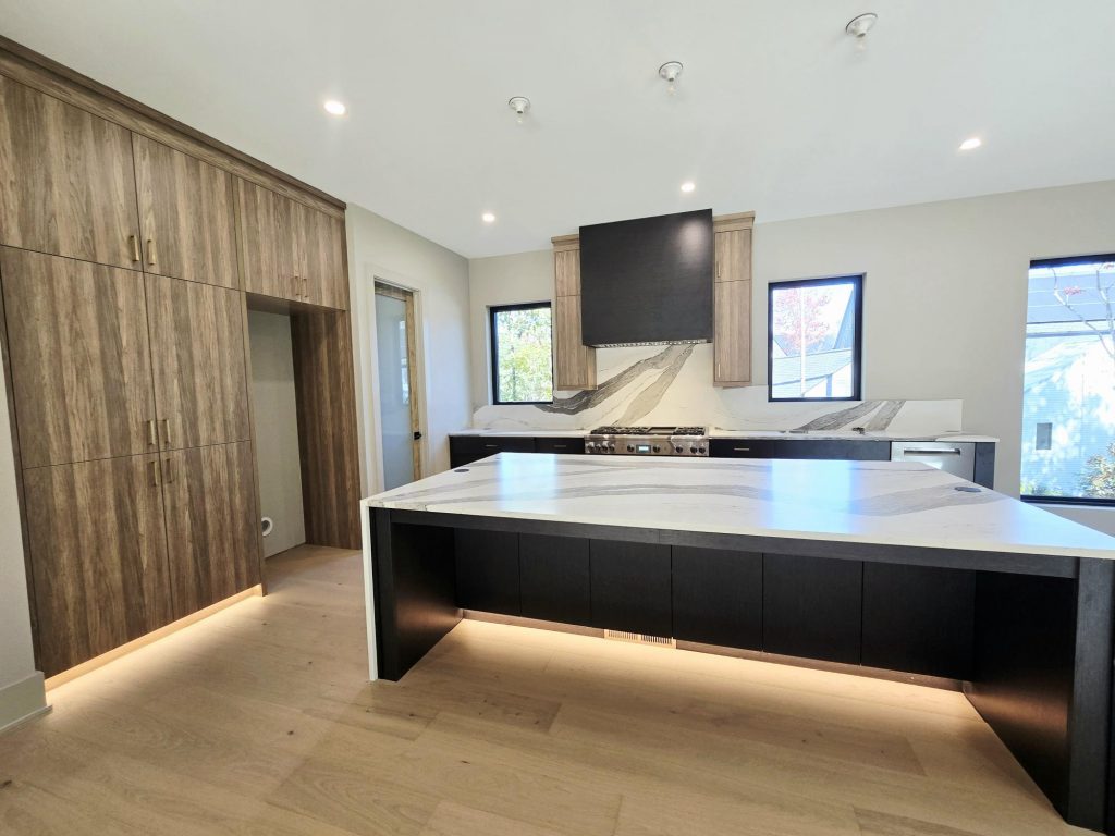 The kitchen is a standout centerpiece, featuring Carrara White Painted Perimeter cabinets, an ash-stained island, Cambria Port Rush quartz countertops and backsplash, and a sleek hood design. Mixed metal accents and clean lines add contemporary flair while maintaining warmth and balance.