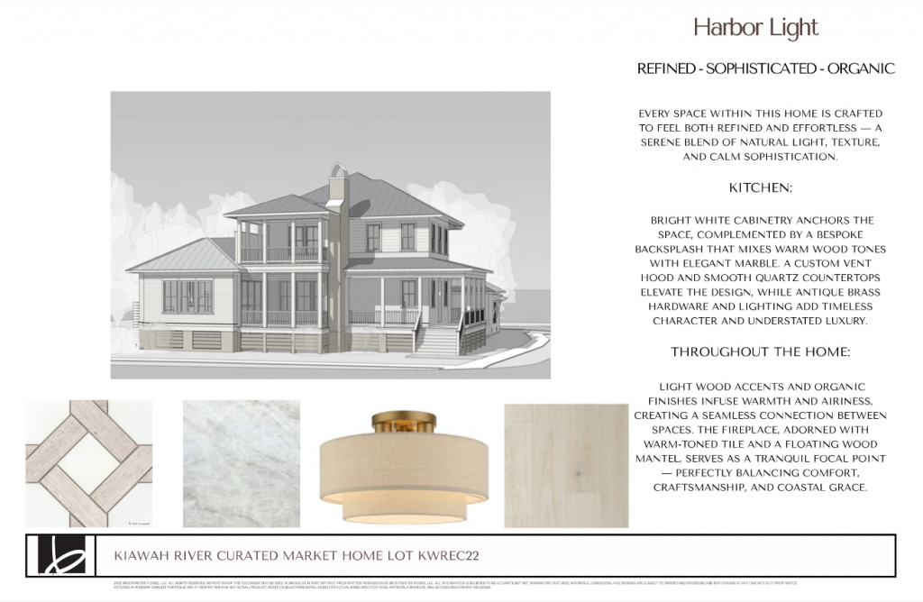 Experience Harbor Light, a Brightwater home at 8015 Jack Island Drive in Kiawah River, where refined sophistication meets organic coastal beauty. Spanning 3,050 square feet with 4 bedrooms and 4.5 baths, this residence captures the essence of effortless Lowcountry living through a serene blend of natural light, texture, and calm sophistication. Every space has been thoughtfully curated to feel both refined and relaxed, from the wrap-around porch that welcomes you home to the screened porch with fireplace, offering tranquil pond views and year-round outdoor living. Inside, the Harbor Light design palette shines — light wood accents and organic finishes infuse warmth and airiness, creating a seamless connection between spaces. In the gourmet kitchen, bright white cabinetry anchors the space, complemented by a bespoke backsplash that blends warm wood tones with elegant marble. A custom vent hood, smooth quartz countertops, and antique brass lighting and hardware add timeless character and understated luxury. The family room fireplace, adorned with warm-toned tile and a floating wood mantle, serves as a tranquil focal point — perfectly balancing comfort, craftsmanship, and coastal grace. The vaulted primary suite offers a peaceful retreat with a spa-inspired bath, while three ensuite guest bedrooms, a loft with covered porch, and a dedicated home office provide flexibility for modern living. Designed as a Zero Energy Ready Home, this residence combines elevated design, advanced sustainability, and authentic Lowcountry elegance — a home that feels as natural as the light that fills it.