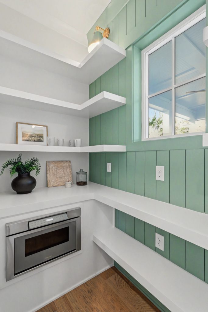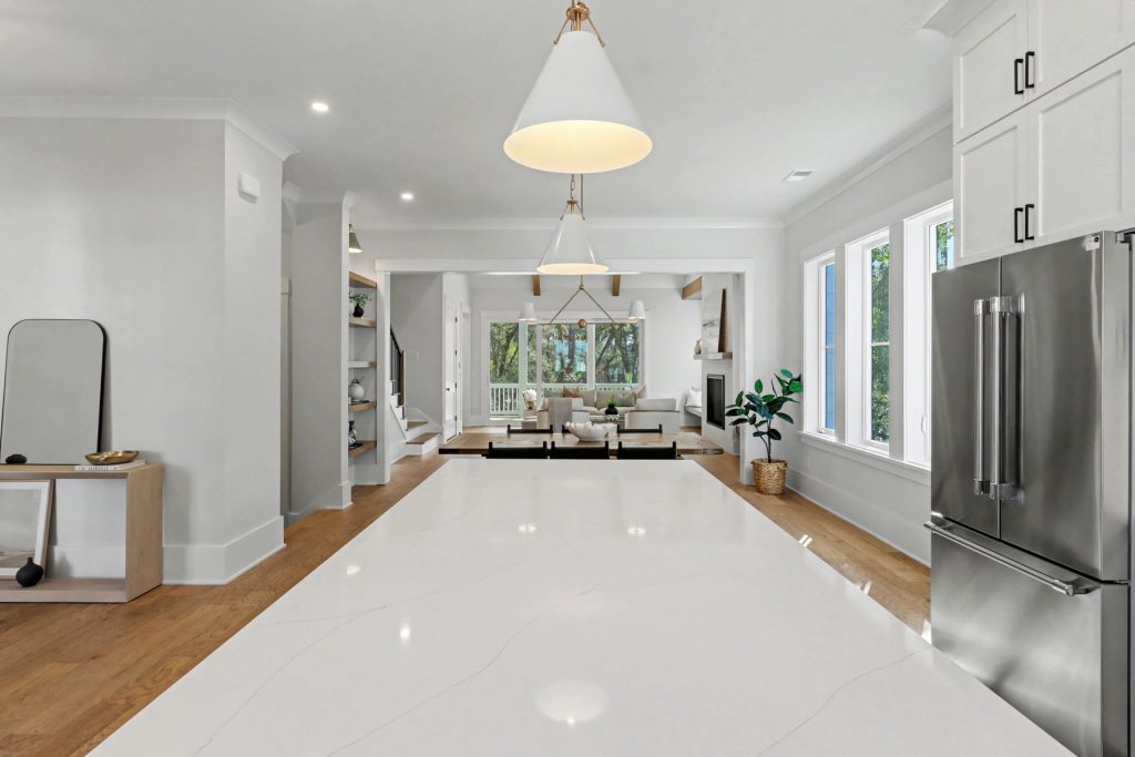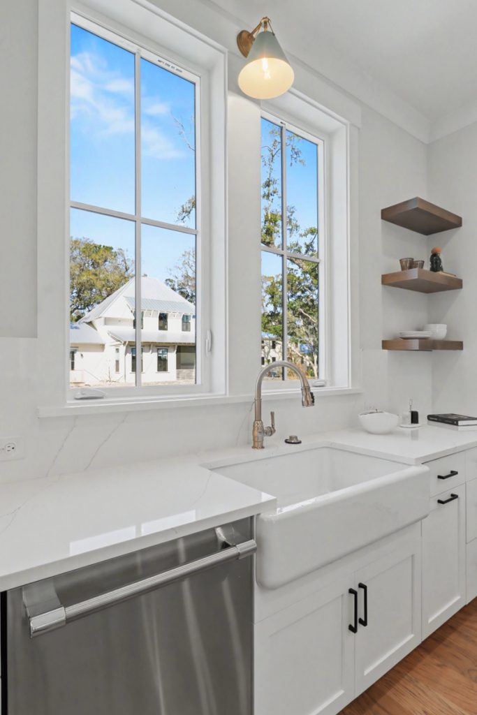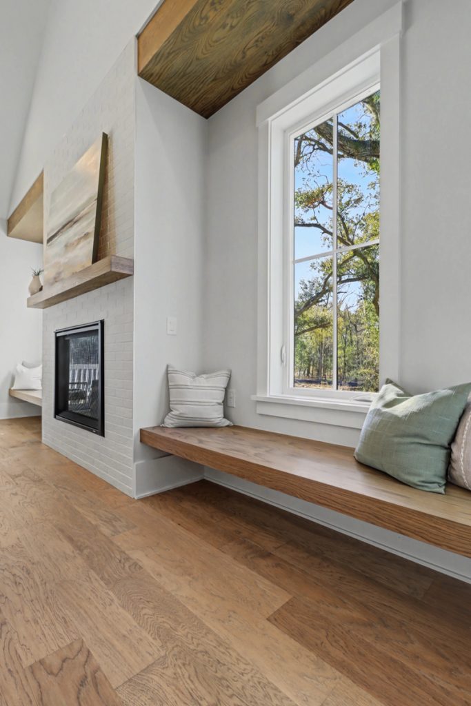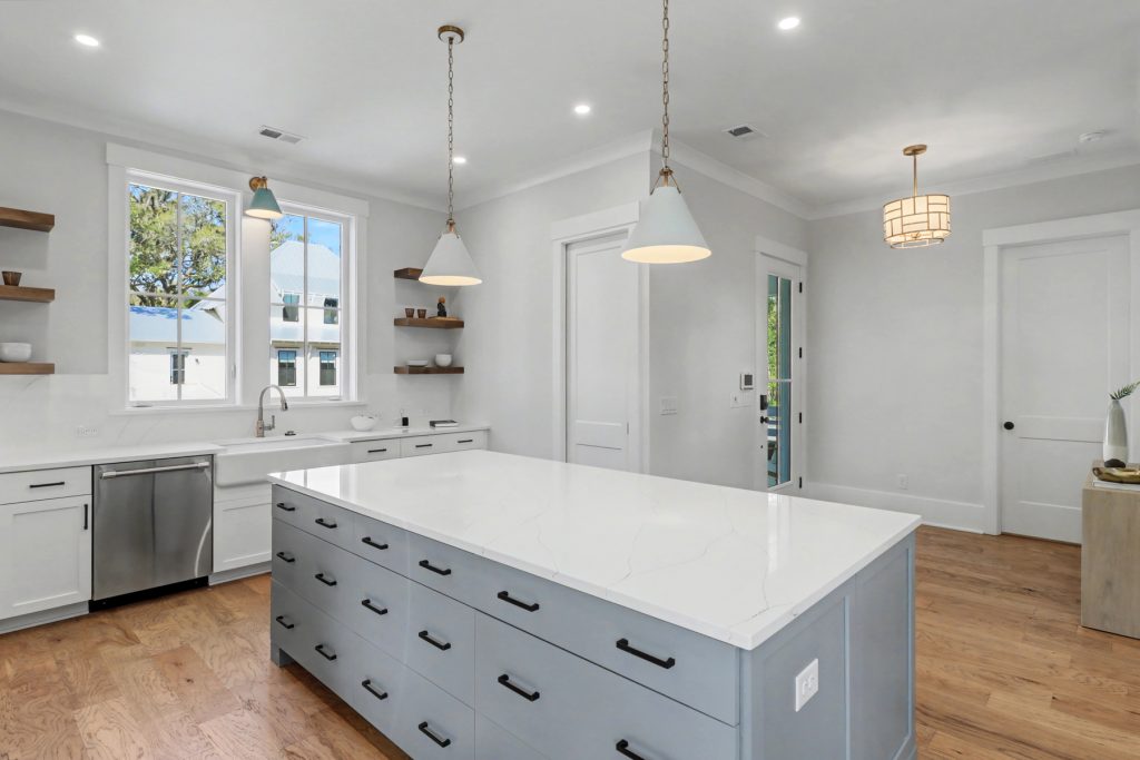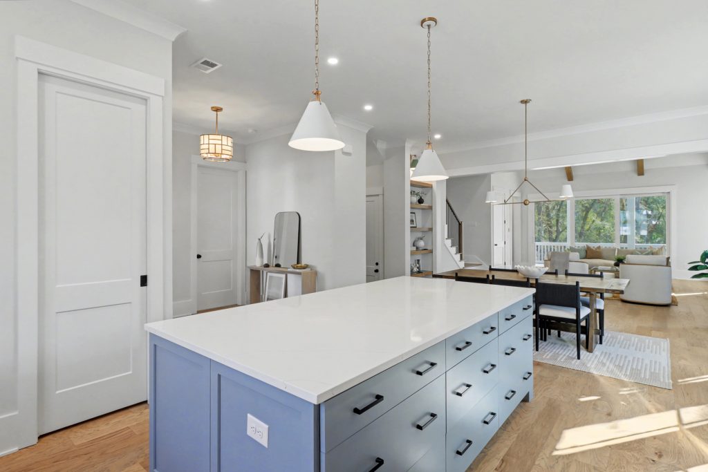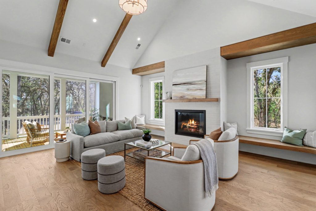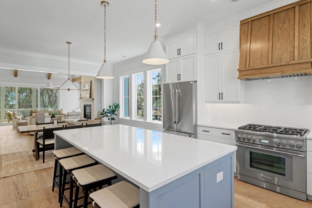 Inspired by the serene beauty of the coast, the Modern aesthetic brings together soft whites, simple textures, and an airy, light-filled ambiance. Warm wood cabinetry in the kitchen extends to the ceiling, complemented by gorgeous quartz countertops that seamlessly continue up the backsplash for a clean, sophisticated look. The blue island serves as a stunning focal point, inviting you to linger over morning coffee while enjoying the picturesque view from the expansive window wall.