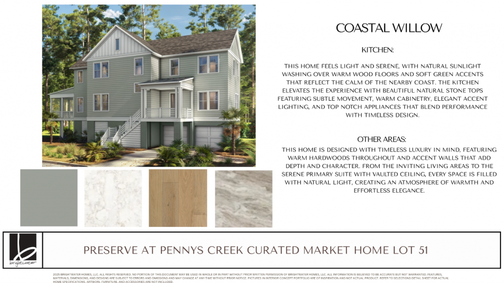 New homes by Brightwater at The Preserve at Pennys Creek combine undeniably Low Country charm inspired by the enchanting details of classic Charleston homes with luxuriously appointed, open interiors designed and personalized for the way you want to live. The result is a home that is timeless, uniquely yours and one-of-a-kind every time.