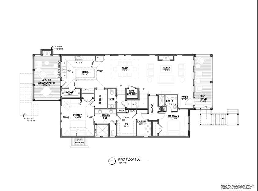 Comfort and convenience are interwoven with the great room, dining room and kitchen as a collective free-flowing living and entertaining space spanning the entire length of the home. The kitchen, the gem of the house, is adorned with vaulted ceilings, and a large pass-through window extending your living space to the built-in bar on the back porch. The screened in back porch is equipped with an optional outdoor fireplace and can be built as a second story piazza or include a staircase for added convenience.