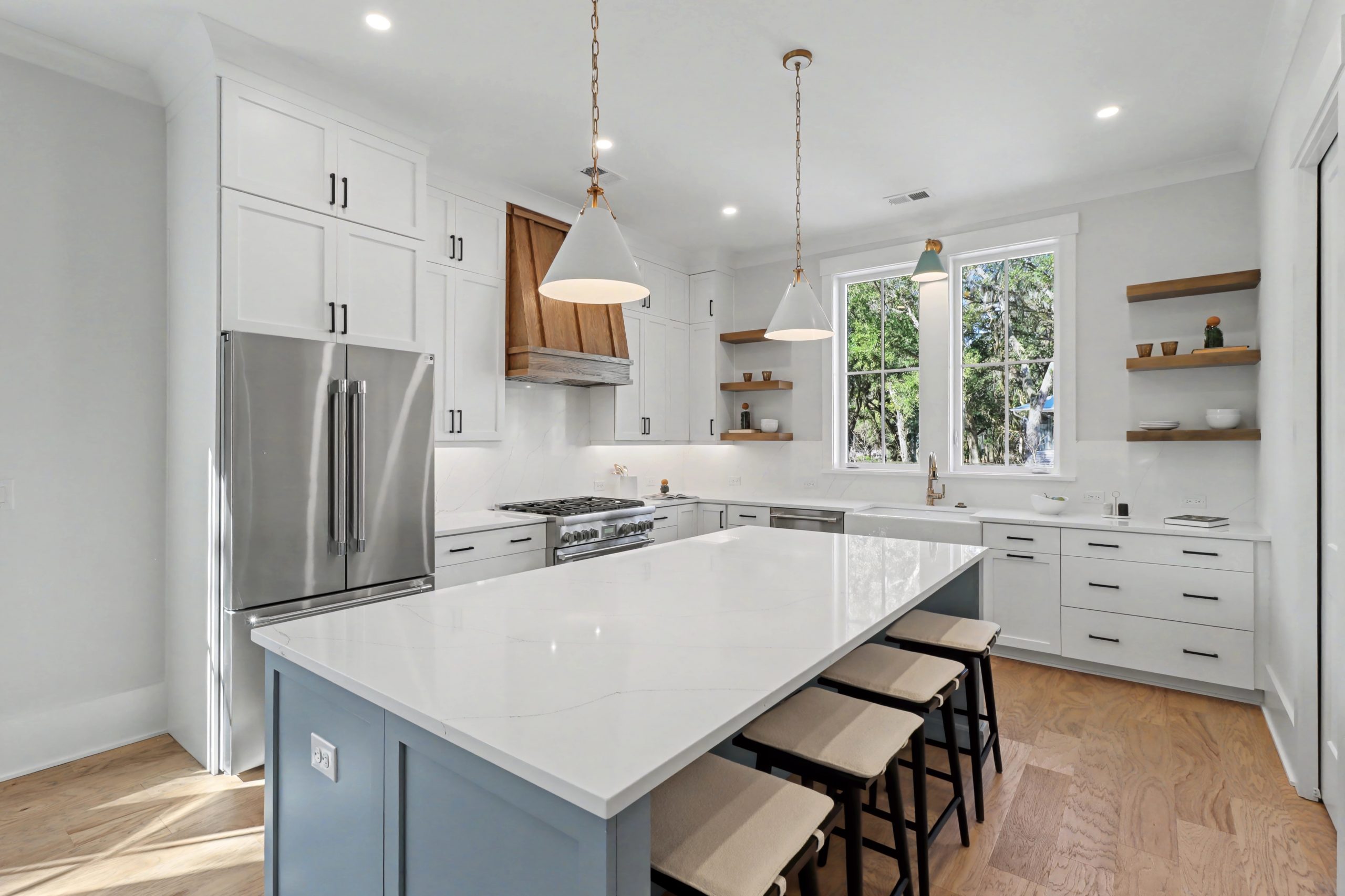 A Modern Aesthetic Inspired by Nature’s Canvas Drawing inspiration from the light-filled ambiance of the coast, the design at 4023 Chantey Crest embraces a palette of soft whites, simple textures, and natural materials. At the heart of this gracious home, modernity and simplicity come together in a chef-appointed kitchen where warm wood cabinetry extends to the ceiling, complemented by a serene blue island that serves as a stunning focal point. This open-concept space is framed by an expansive window wall, ensuring that the picturesque views remain an integral part of your daily rhythm.