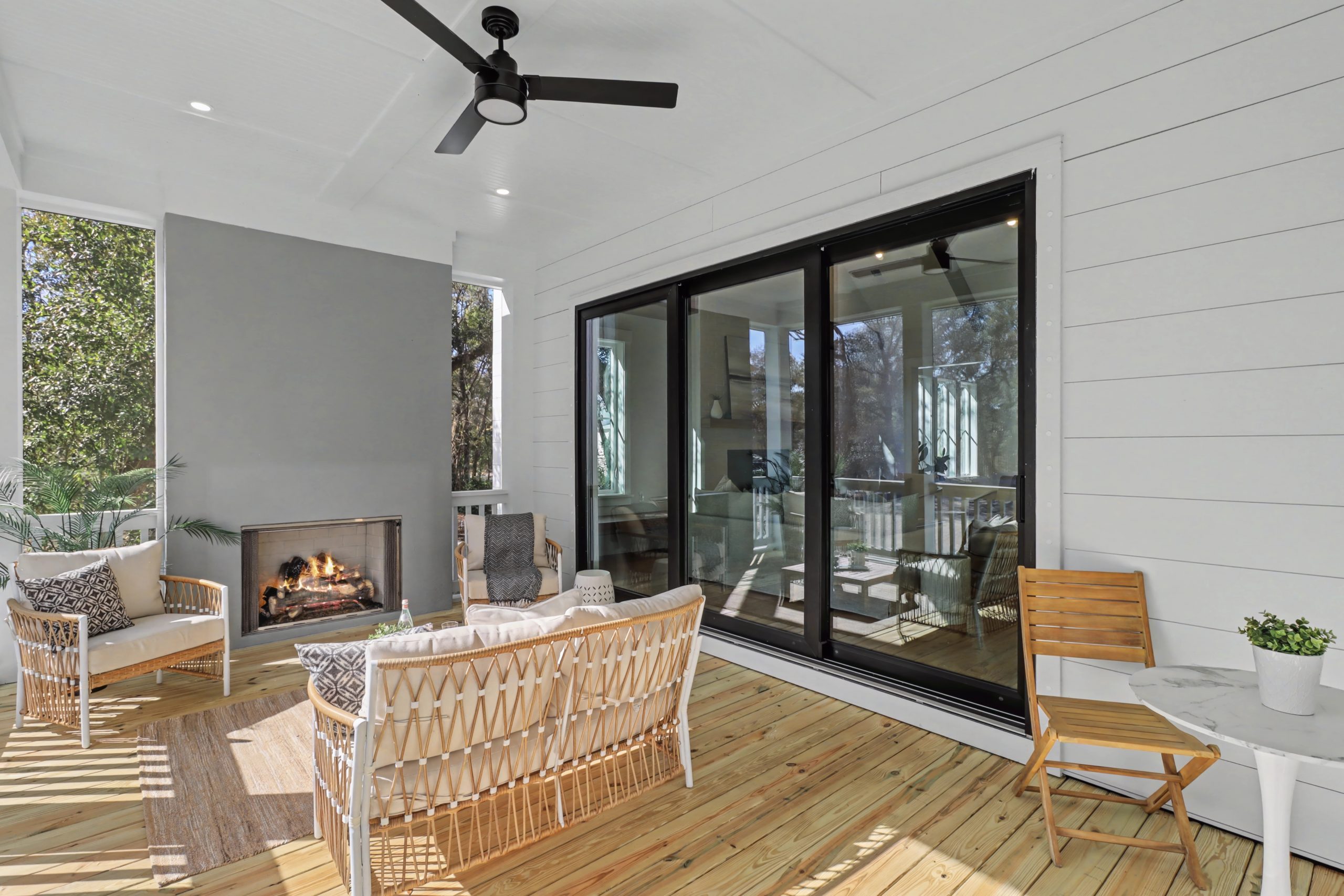 Thoughtful Blending of Indoors and Out True to Brightwater’s philosophy that “form follows function,” this home cultivates a deep connection to the natural world. The breathtaking vaulted fireside family room features a grand slider door that dissolves the wall between the interior and a covered, screened porch. Complete with its own outdoor fireplace, this space is ideal for enjoying cooler spring evenings while listening to the distant sounds of the river. The main level further prioritizes ease and elegance with a vaulted primary suite—a peaceful retreat featuring a spa-inspired bath—and a private guest suite that offers visitors a secluded sanctuary of their own.
