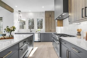 A welcoming foyer entry opens up into the home’s gracious open kitchen and main living area, washed in natural light from large and plentiful windows. The kitchen is sophisticated yet sleek blending natural wood tones, crisp black accents, and white quartz while the family room’s full wall fireplace designs beckons you to gather, relax, and enjoy. Glass slider doors full open to the covered deck for an easy organic connection between indoors and out. The first floor primary suite is a private retreat highlighted by soaring vaulted ceilings and an indulgent spa-inspired bath complete with dual vanities, soaking tub, separate shower, and oversized walk-in closet with space for a washer and dryer. A dedicated work from home space rounds out the main level.